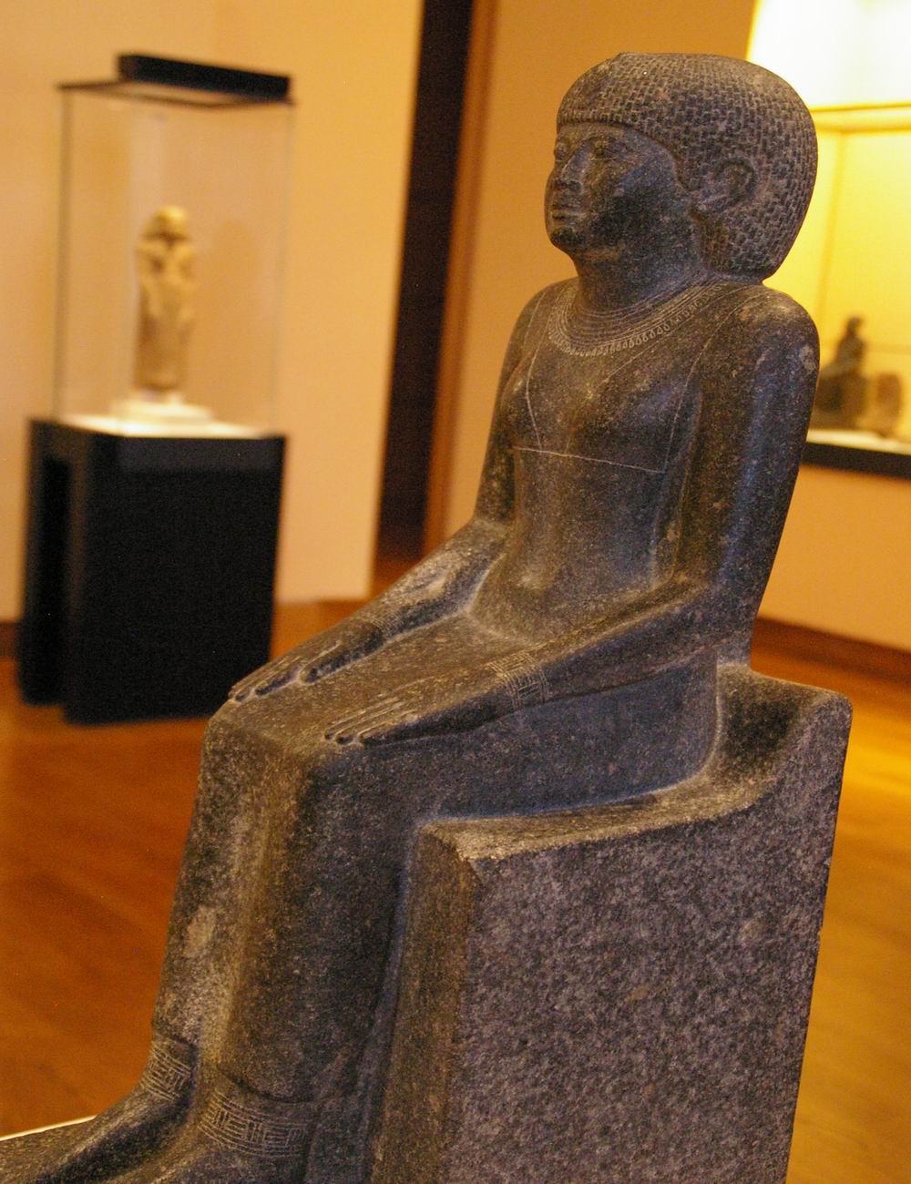 Statue d'un personnage assis sur un siège cubique.