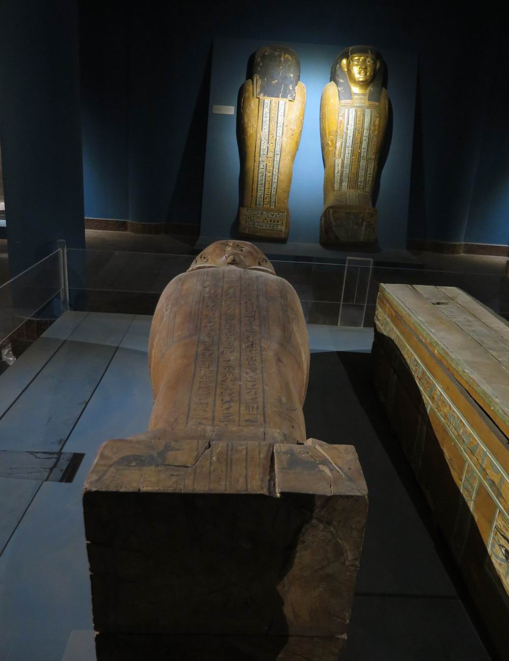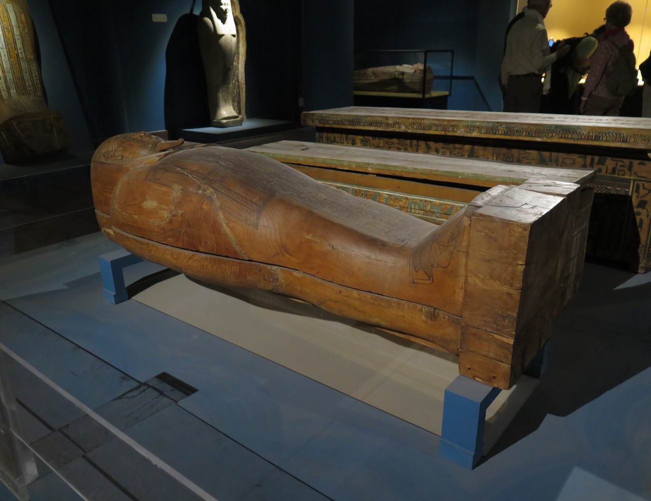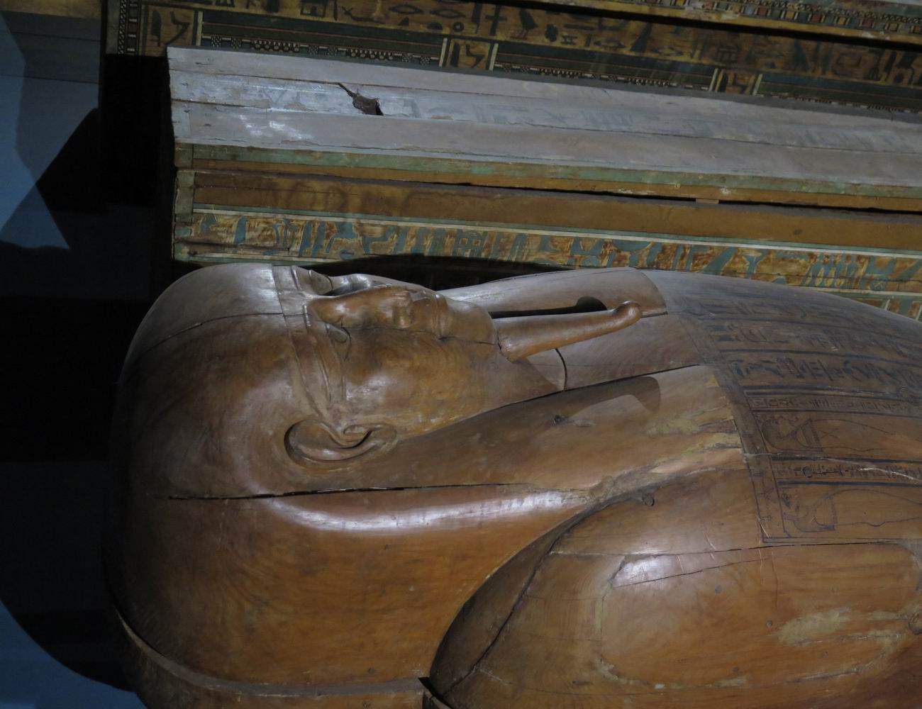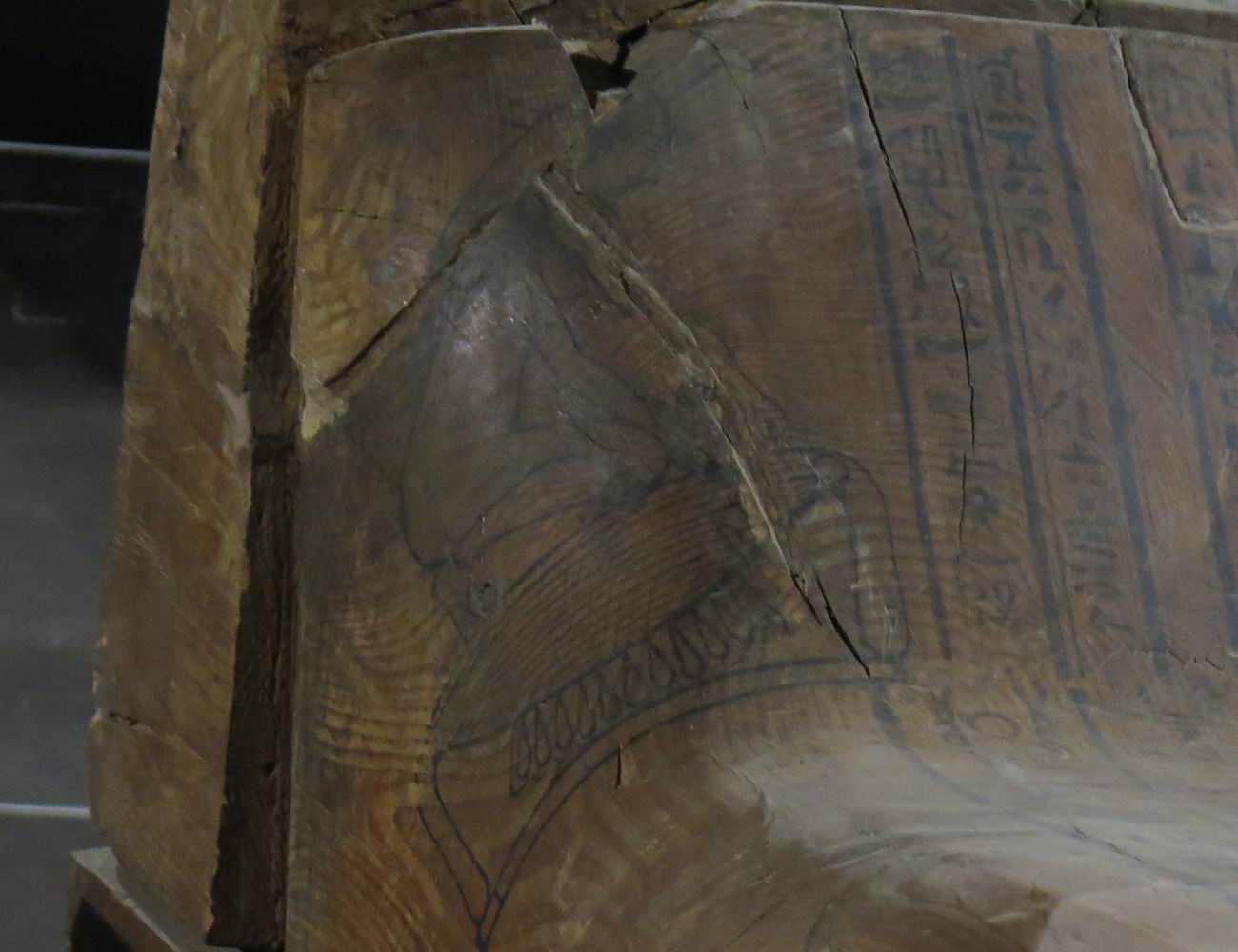 Tête du sarcophage momiforme portant la barbe recourbée, barbe d'Osiris, barbe du défunt. | |||