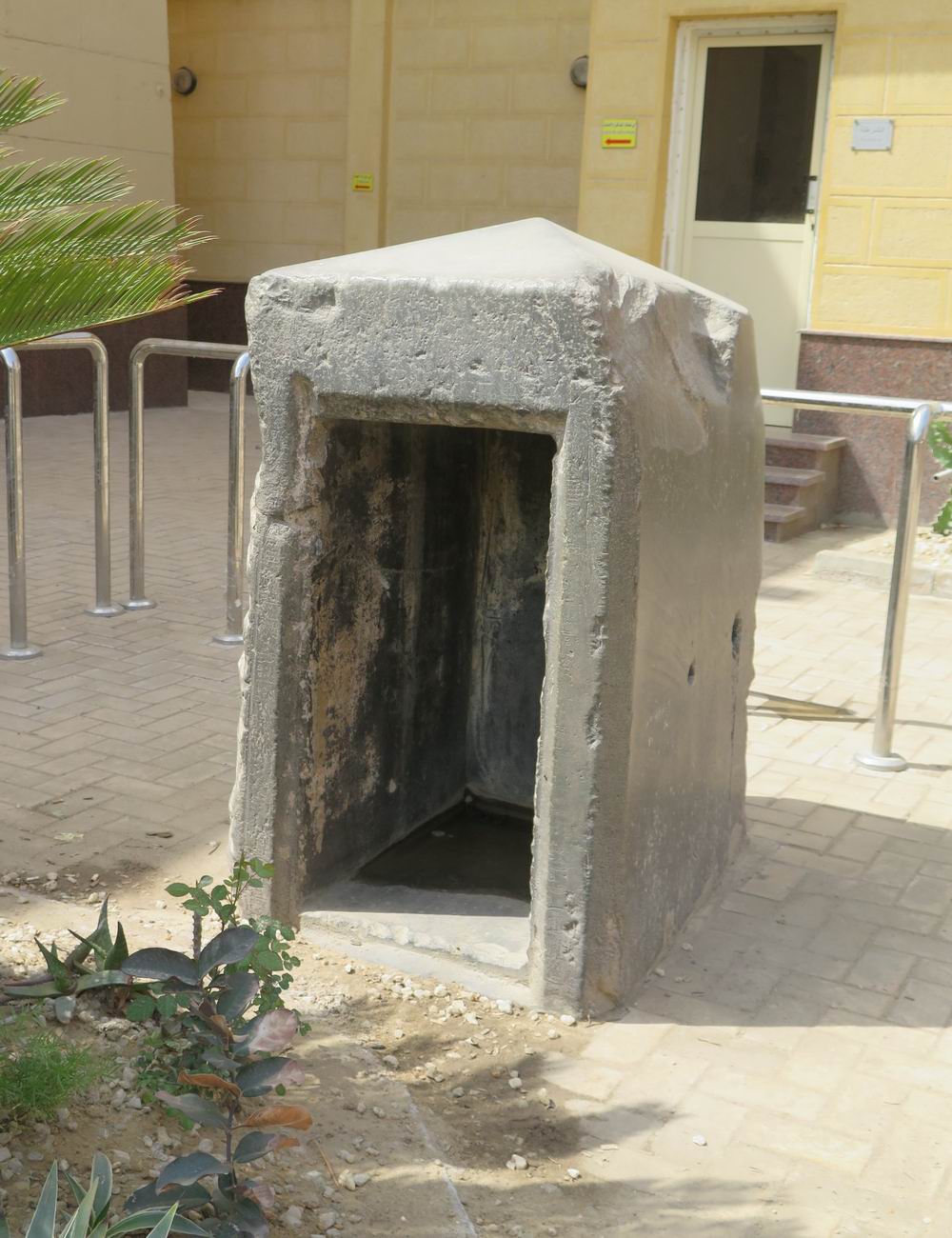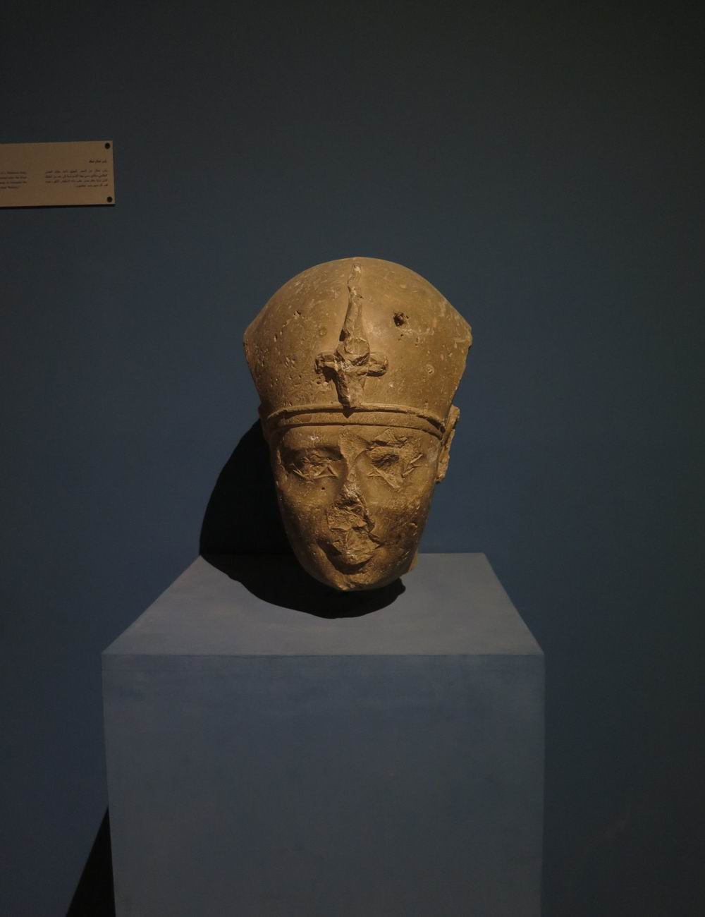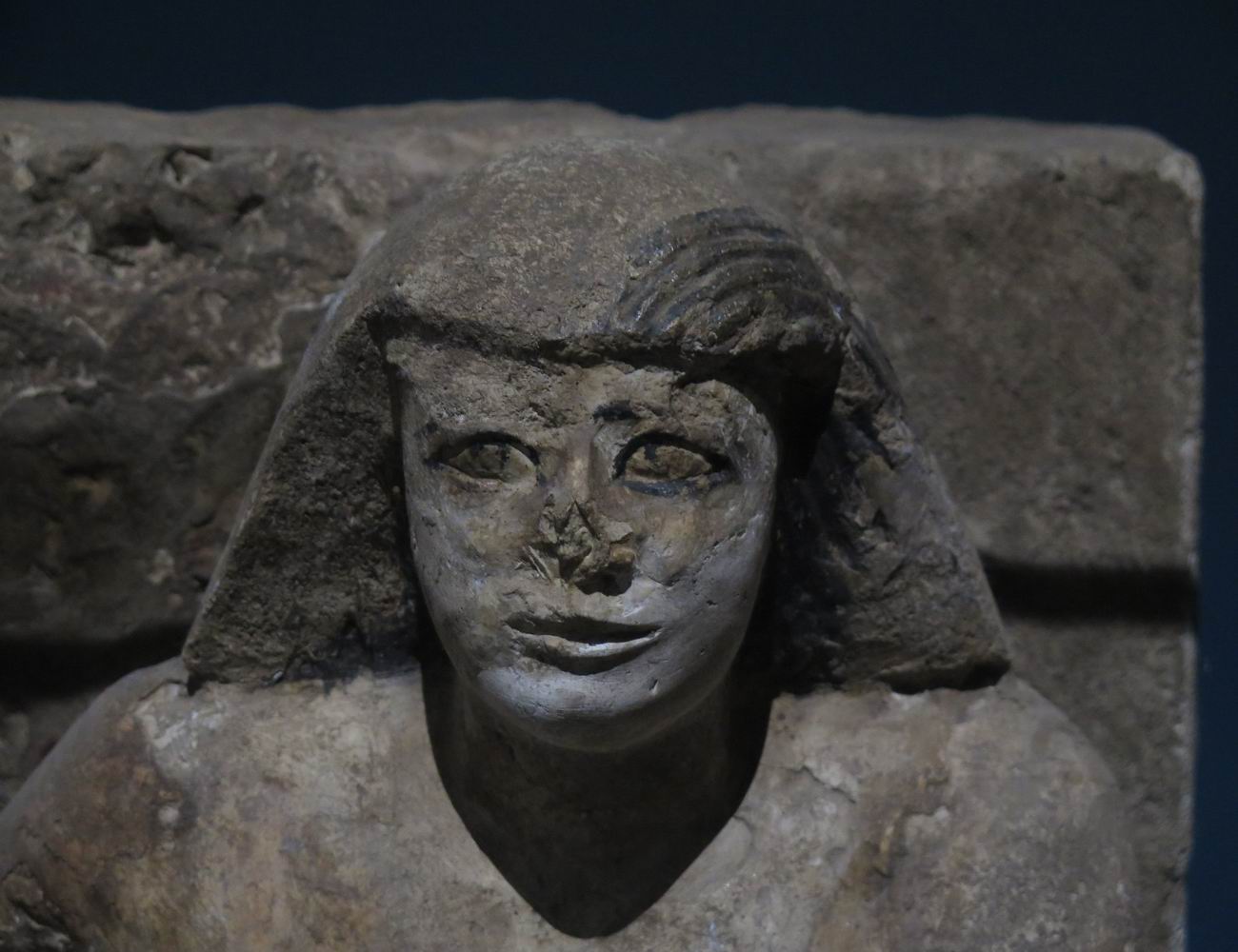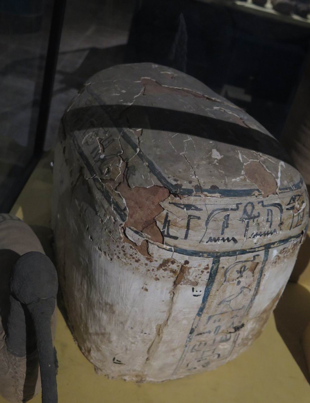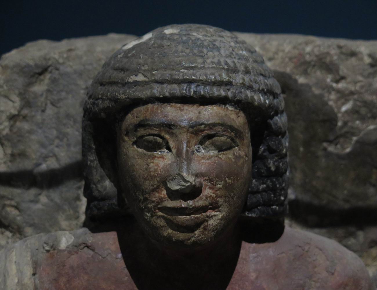 Tête du sarcophage momiforme portant la barbe recourbée, barbe d'Osiris, barbe du défunt. | |||