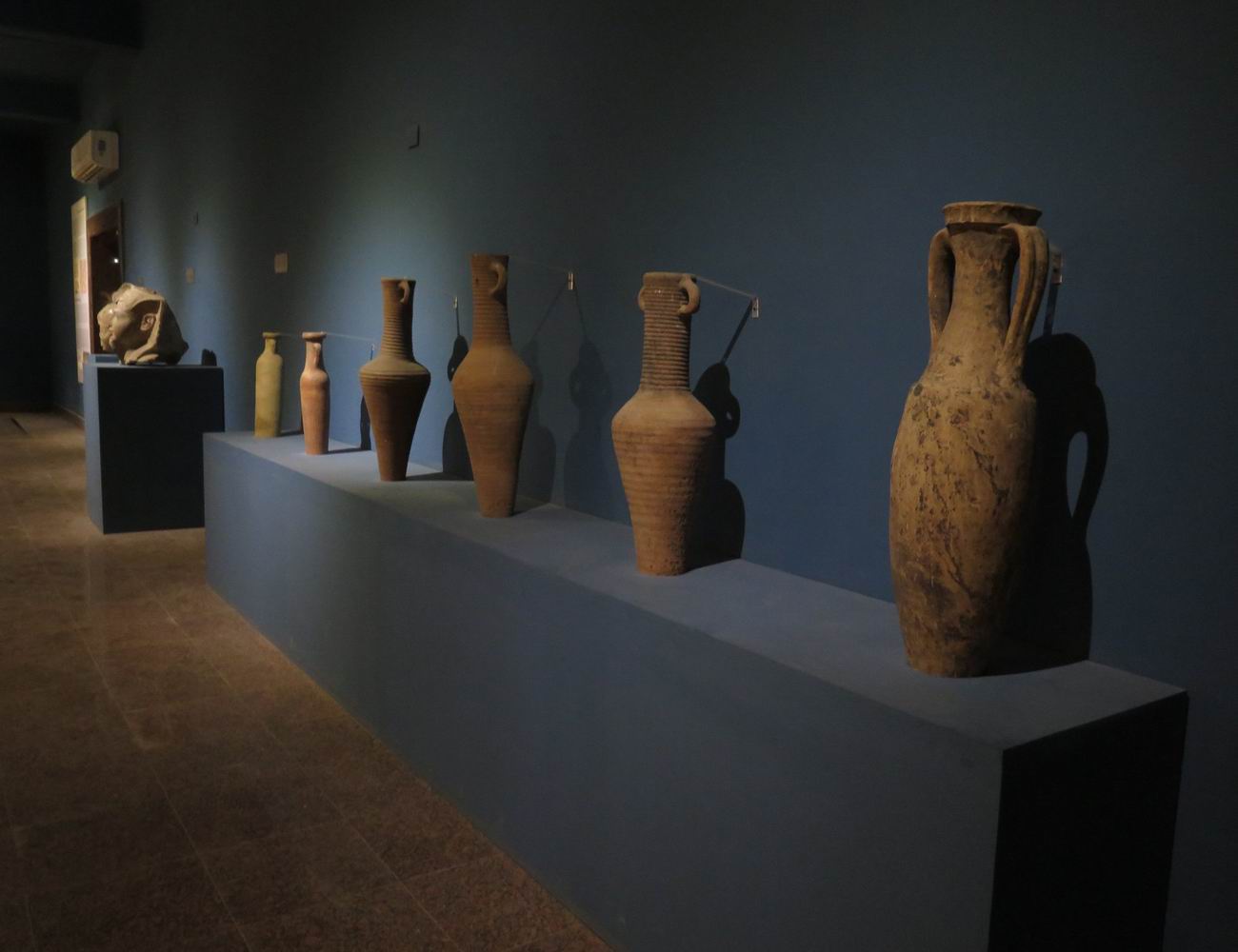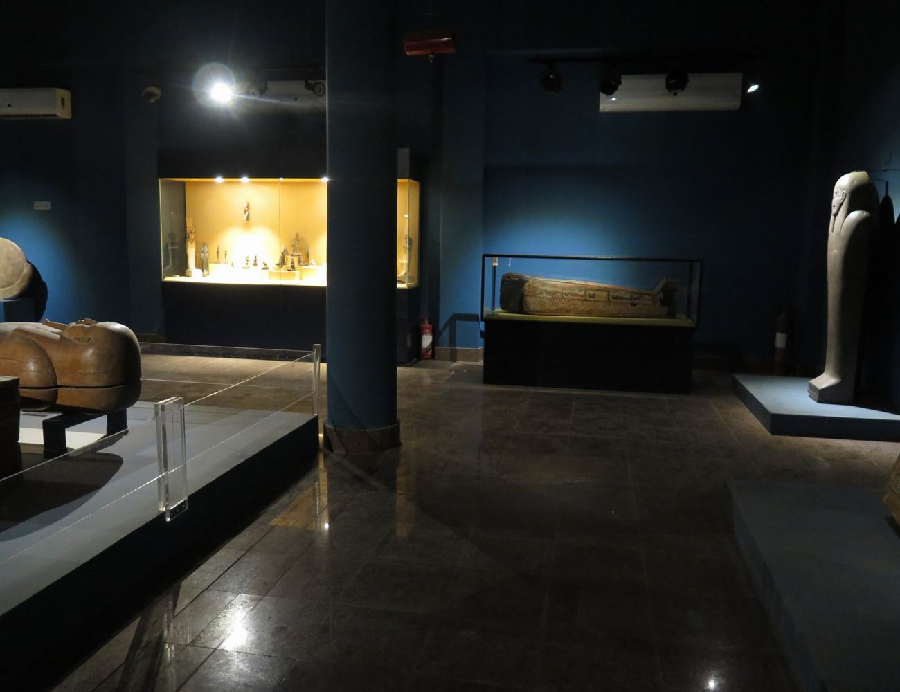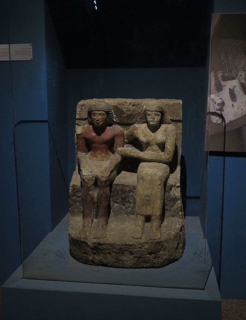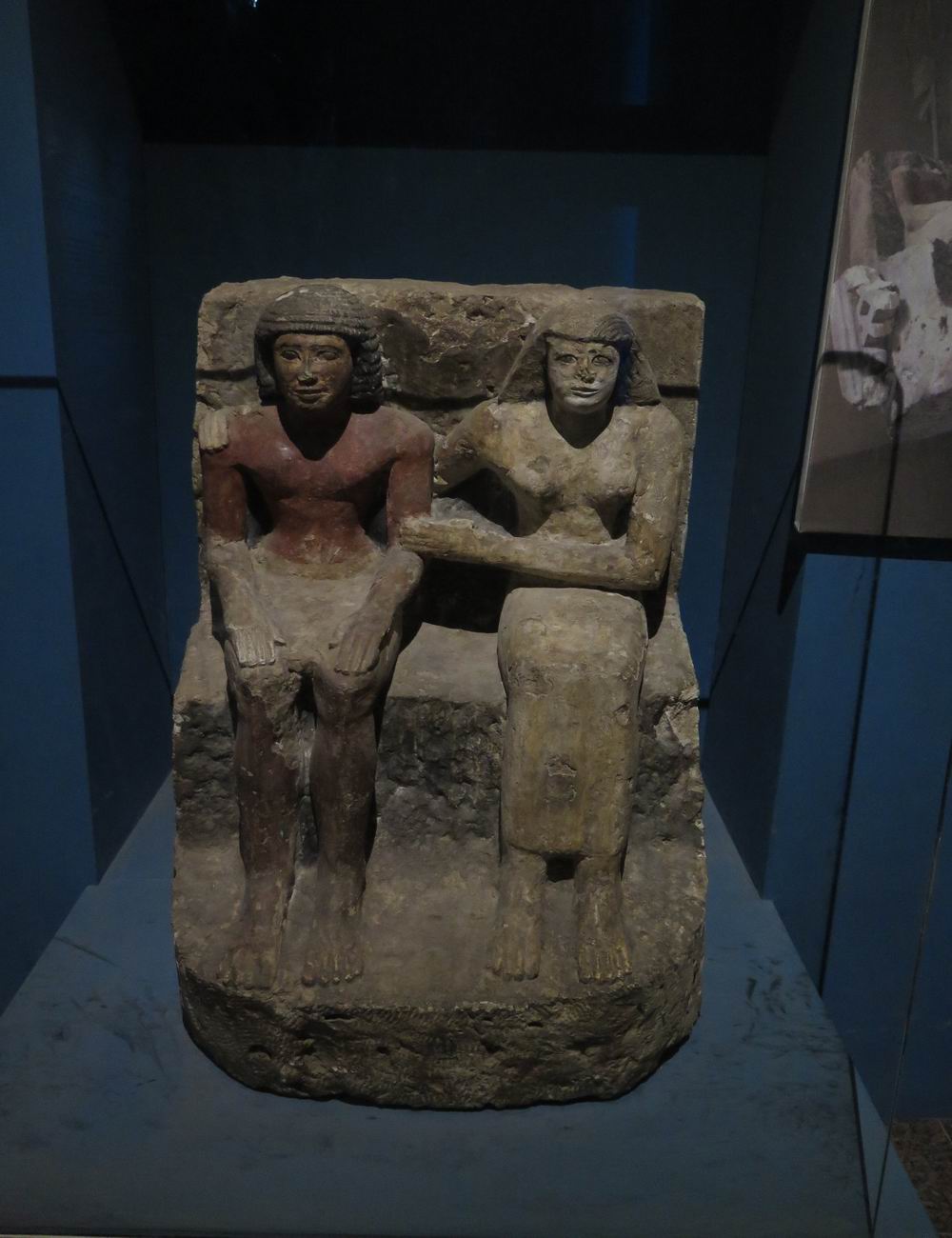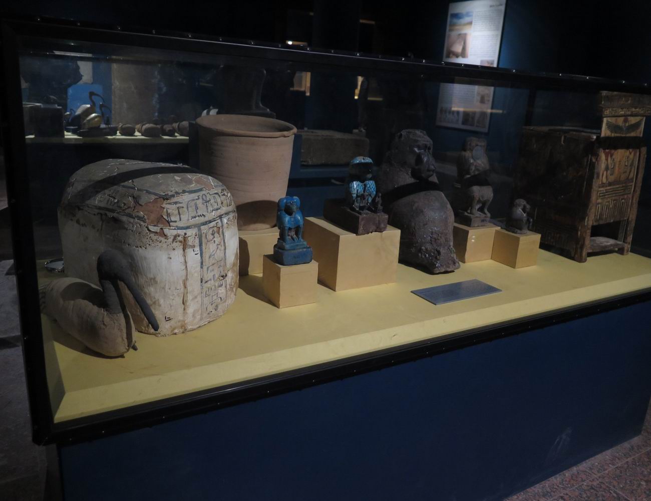 forme du babouin, et deux statuettes de femmes assises avec une stèle devant