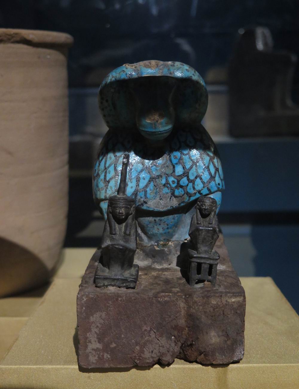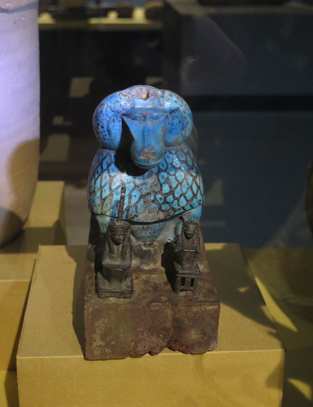 forme du babouin et deux statuettes de déesses. Au-dessus du crâne une encoche devait supporter un disque lunaire. |