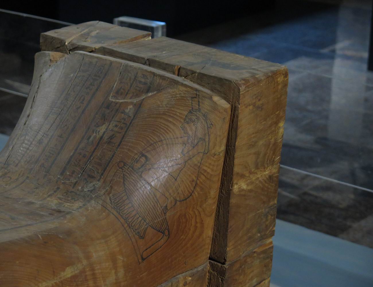 Sur le pied du sarcophage nous trouvons la déesse Isis agenouillée sur le signe de l'or. | |||