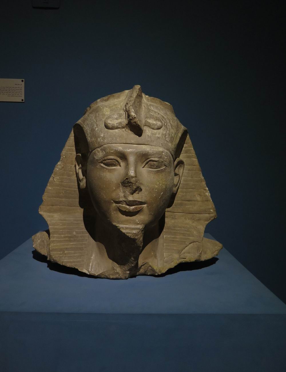 Tête royale coiffée du némès, l'uraeus au front et la barbe droite au menton. | |||