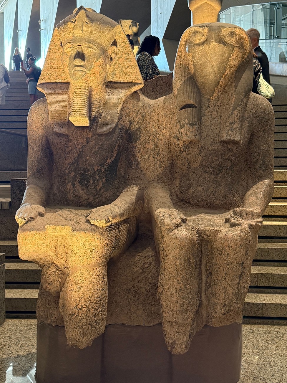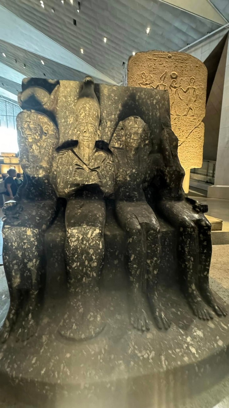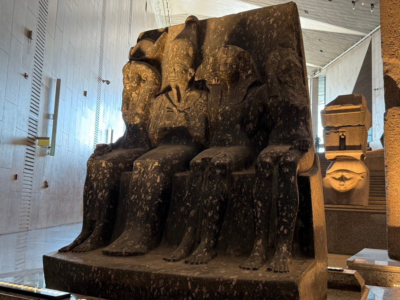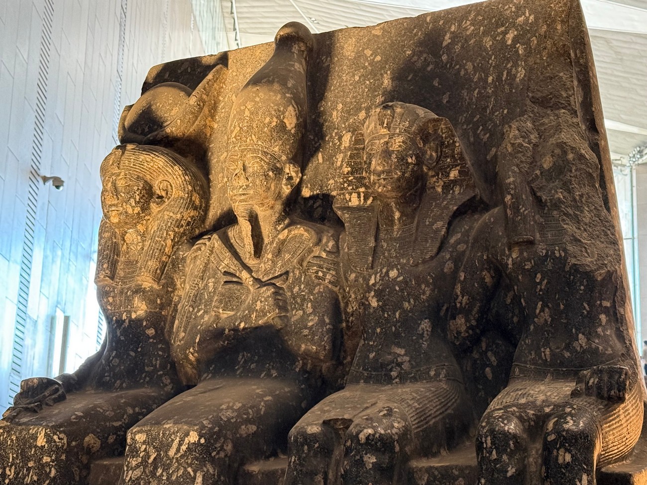 statuaire avec la déesse Hathor ou Isis, le dieu Osiris et le roi,