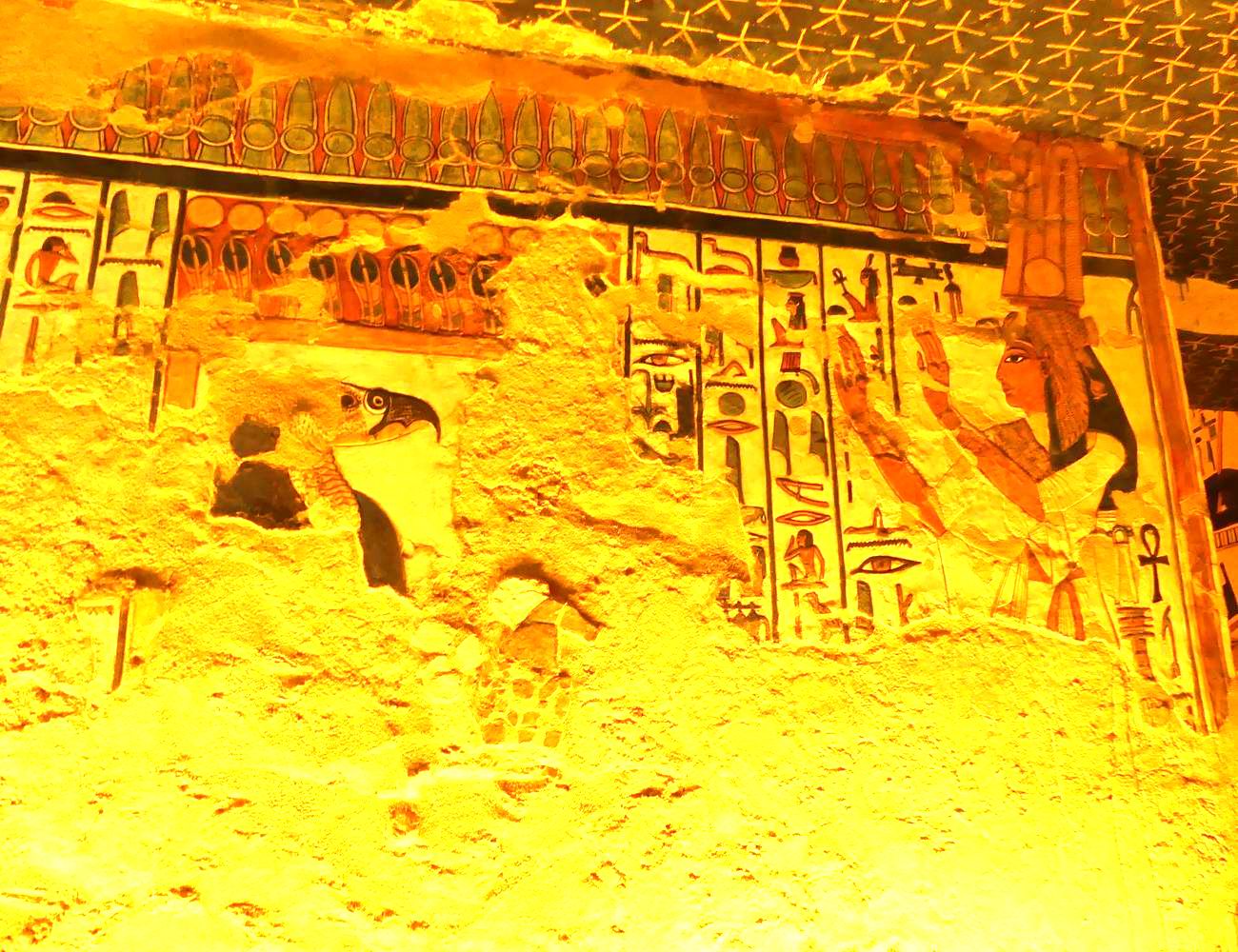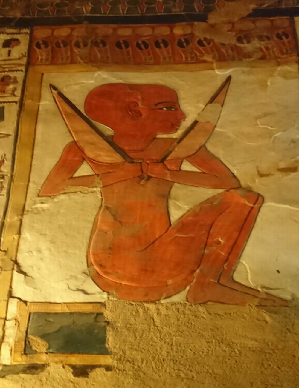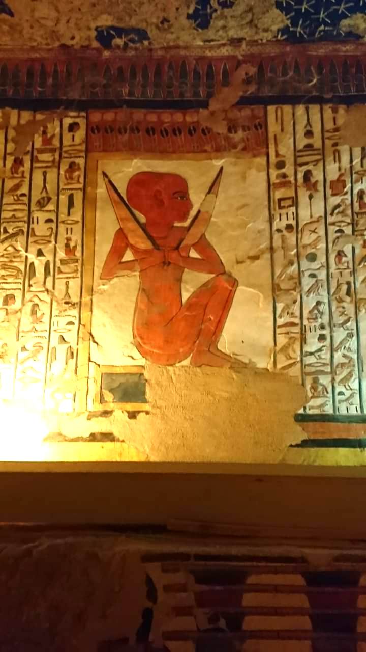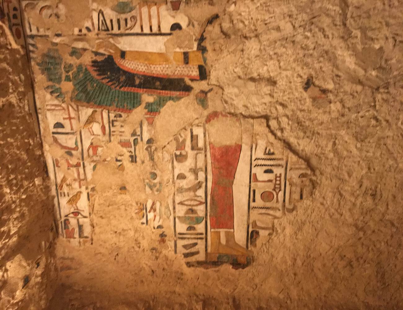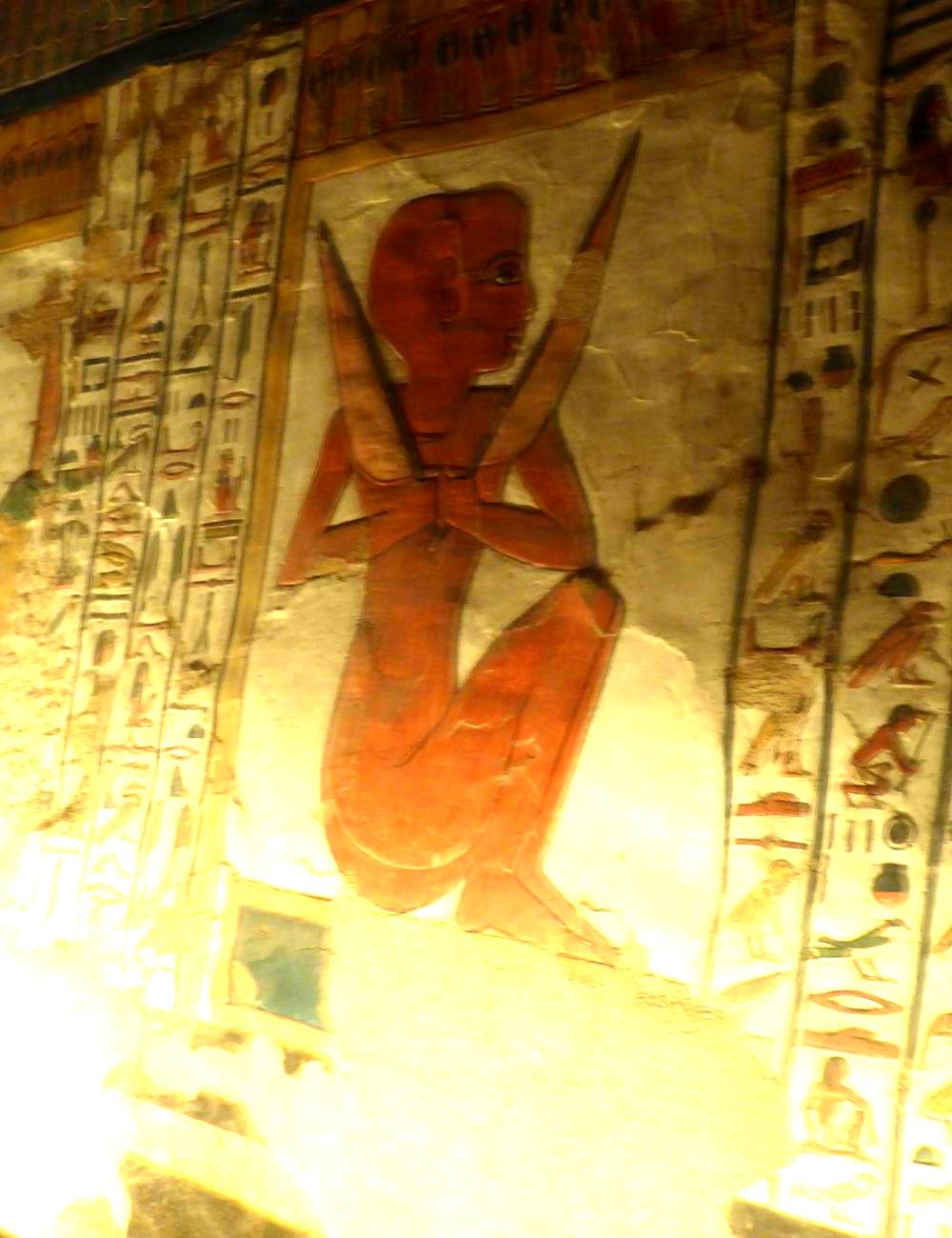 | Le mur du fond nous montre la déesse Maât, debout les bras ailés déployés pour protéger. | ||||||||||||