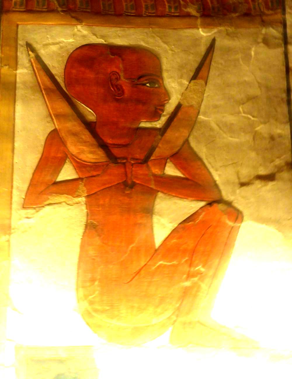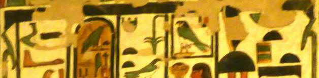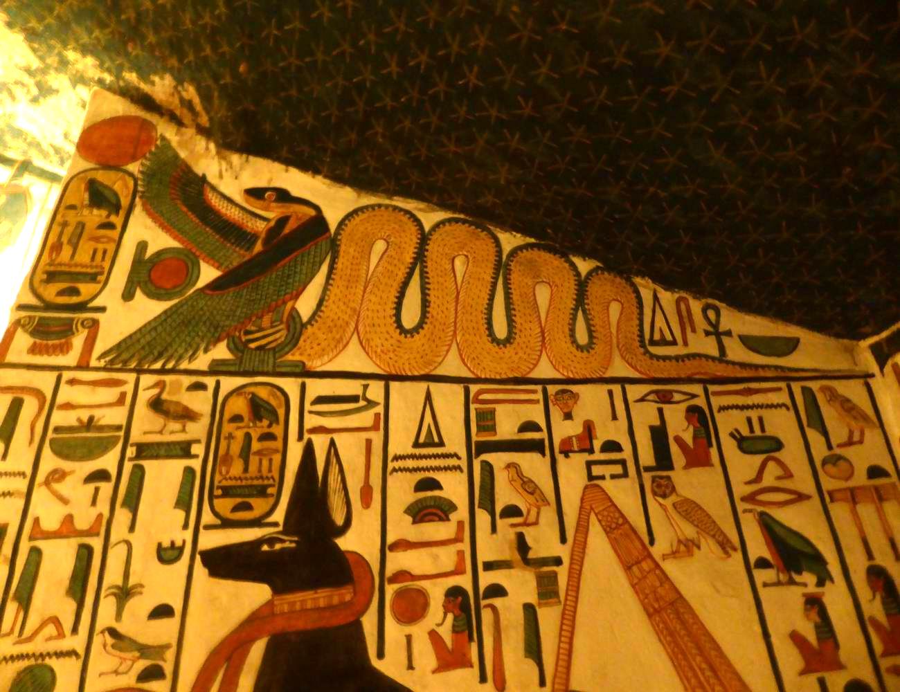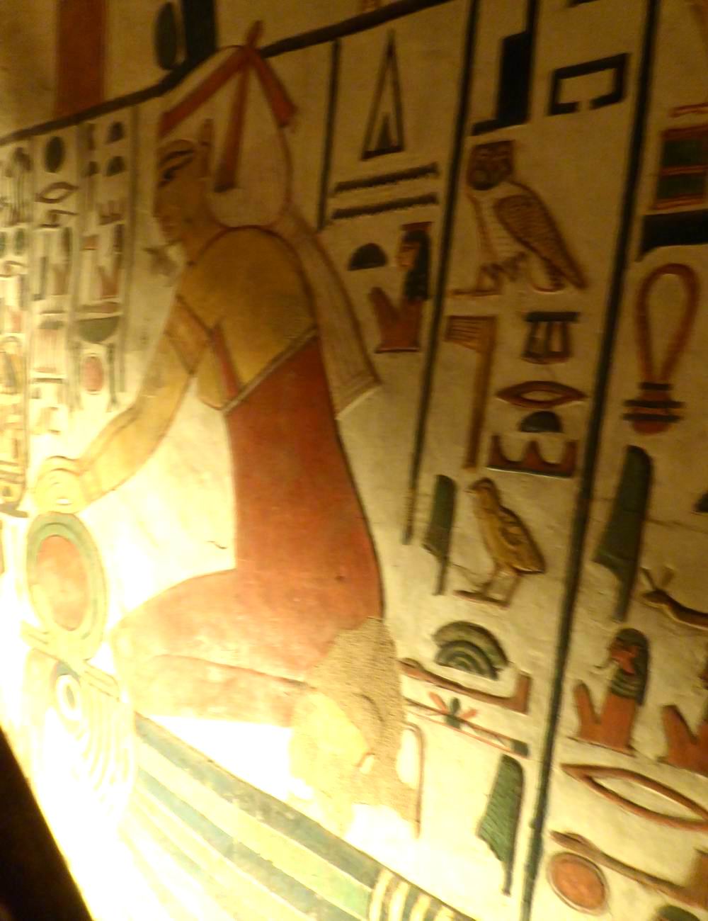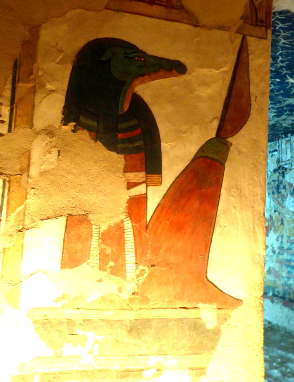 | Le mur du fond nous montre la déesse Maât, debout les bras ailés déployés pour protéger. | ||||||||||||