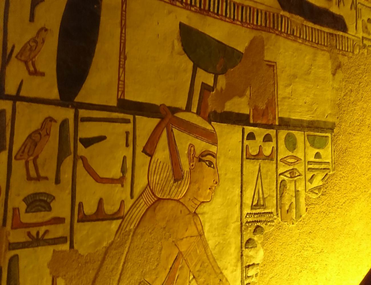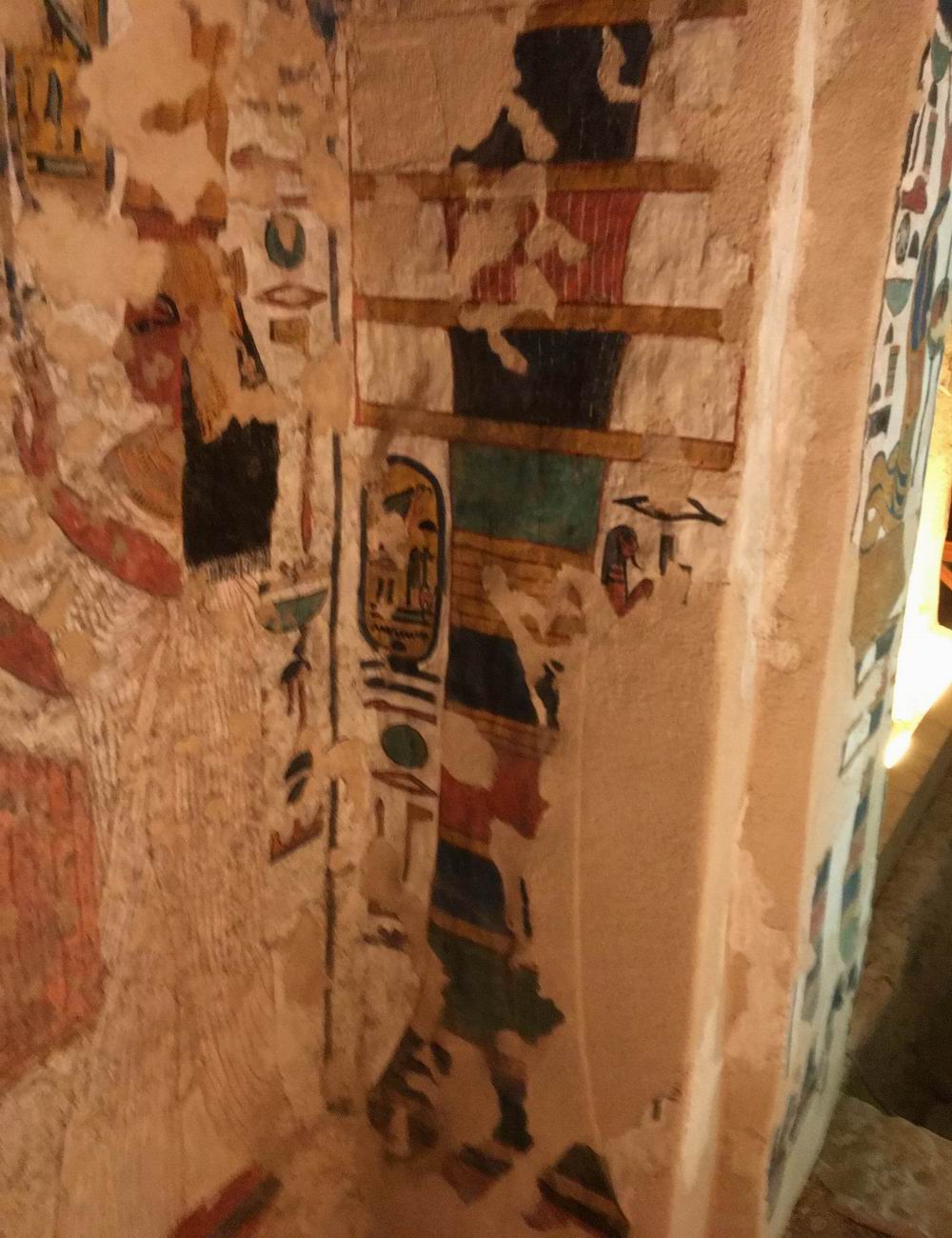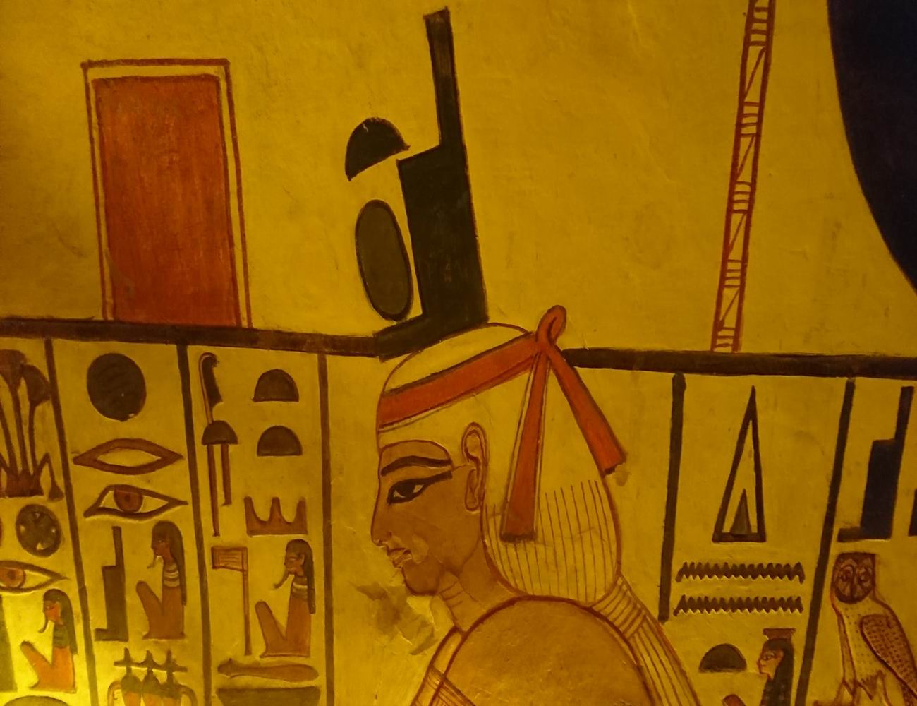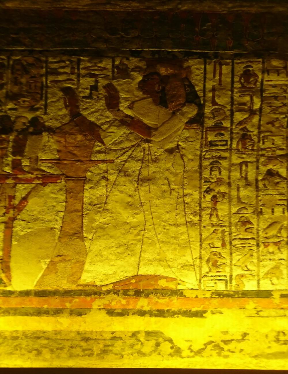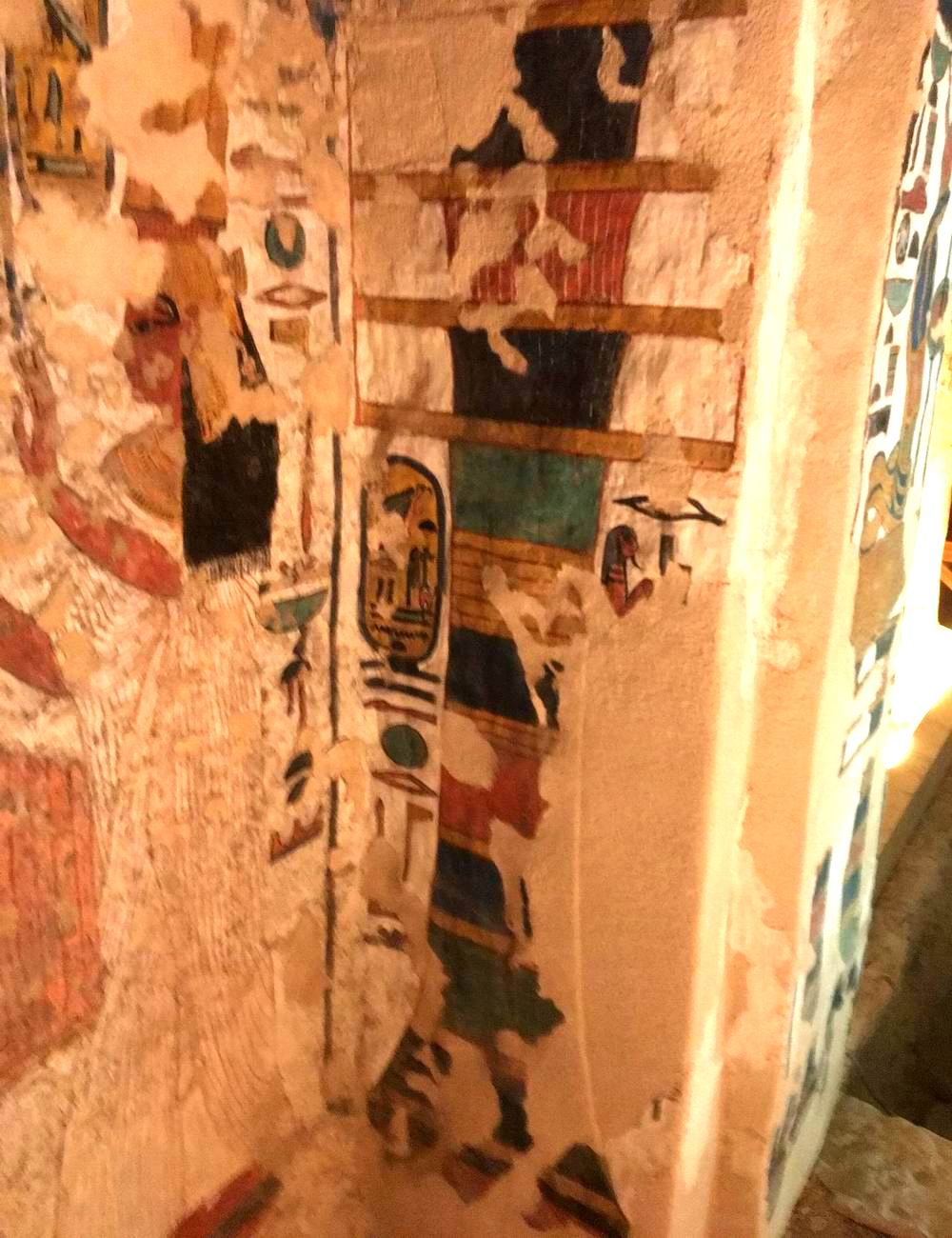 | Le mur du fond nous montre la déesse Maât, debout les bras ailés déployés pour protéger. | ||||||||||||
