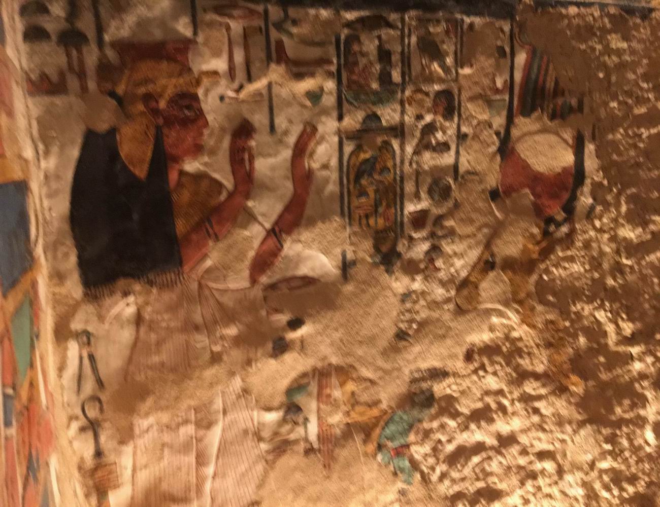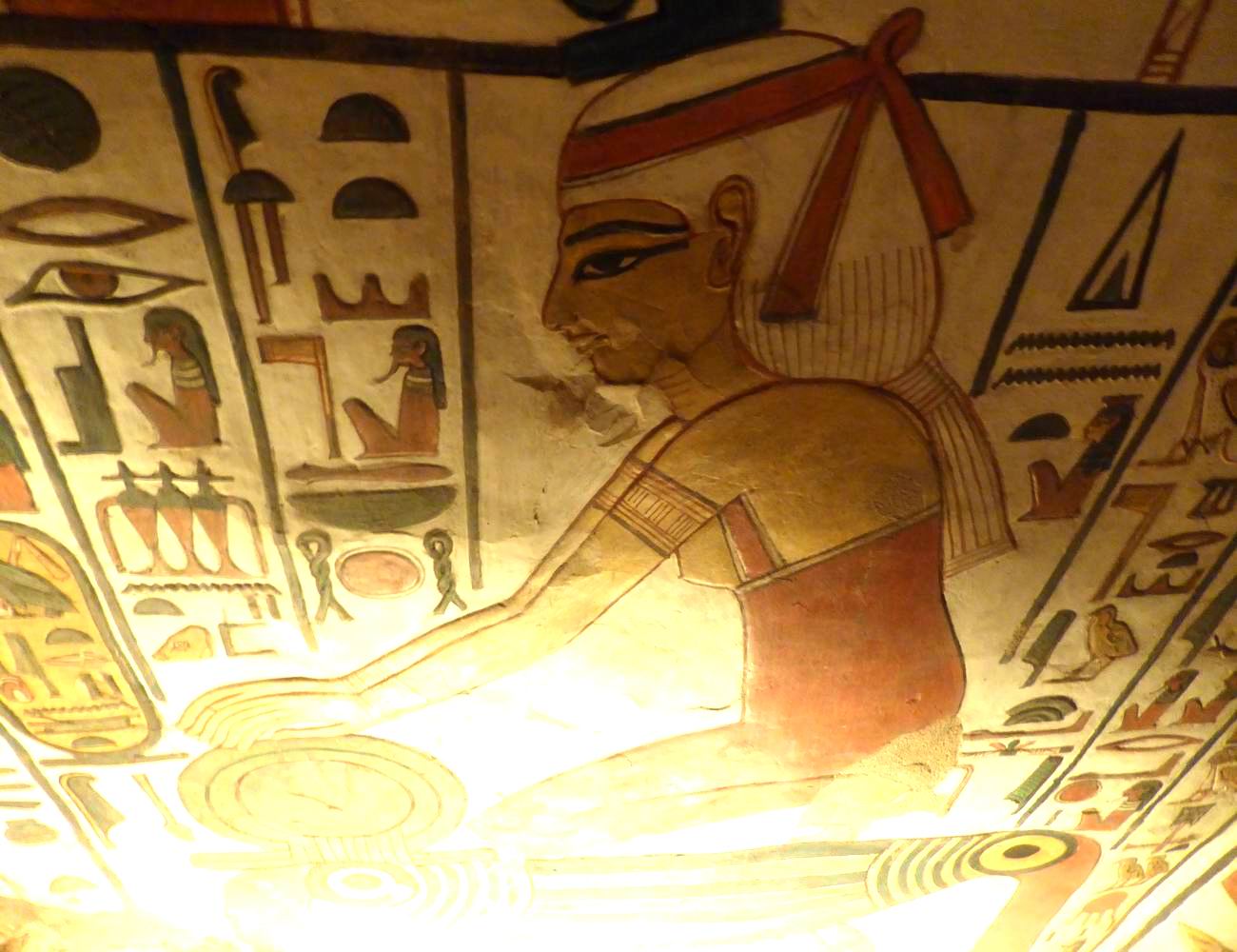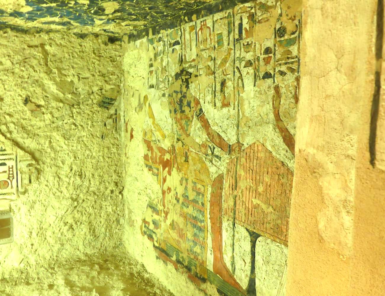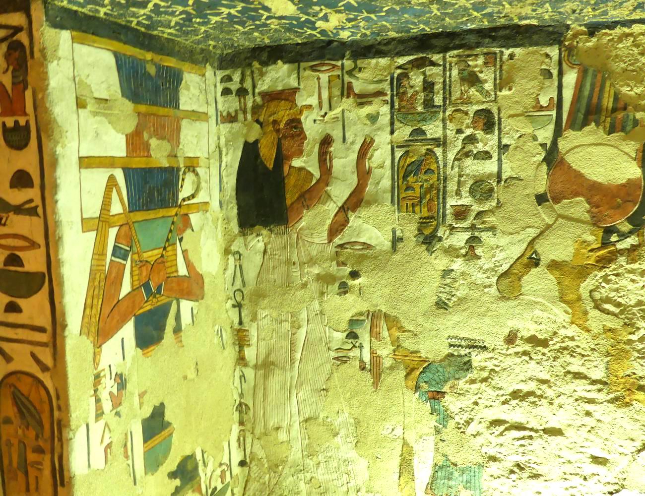 | Le mur du fond nous montre la déesse Maât, debout les bras ailés déployés pour protéger. | ||||||||||||