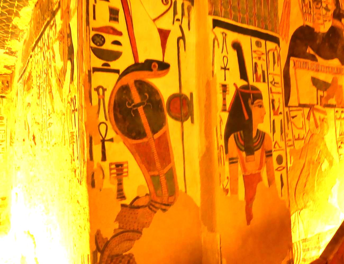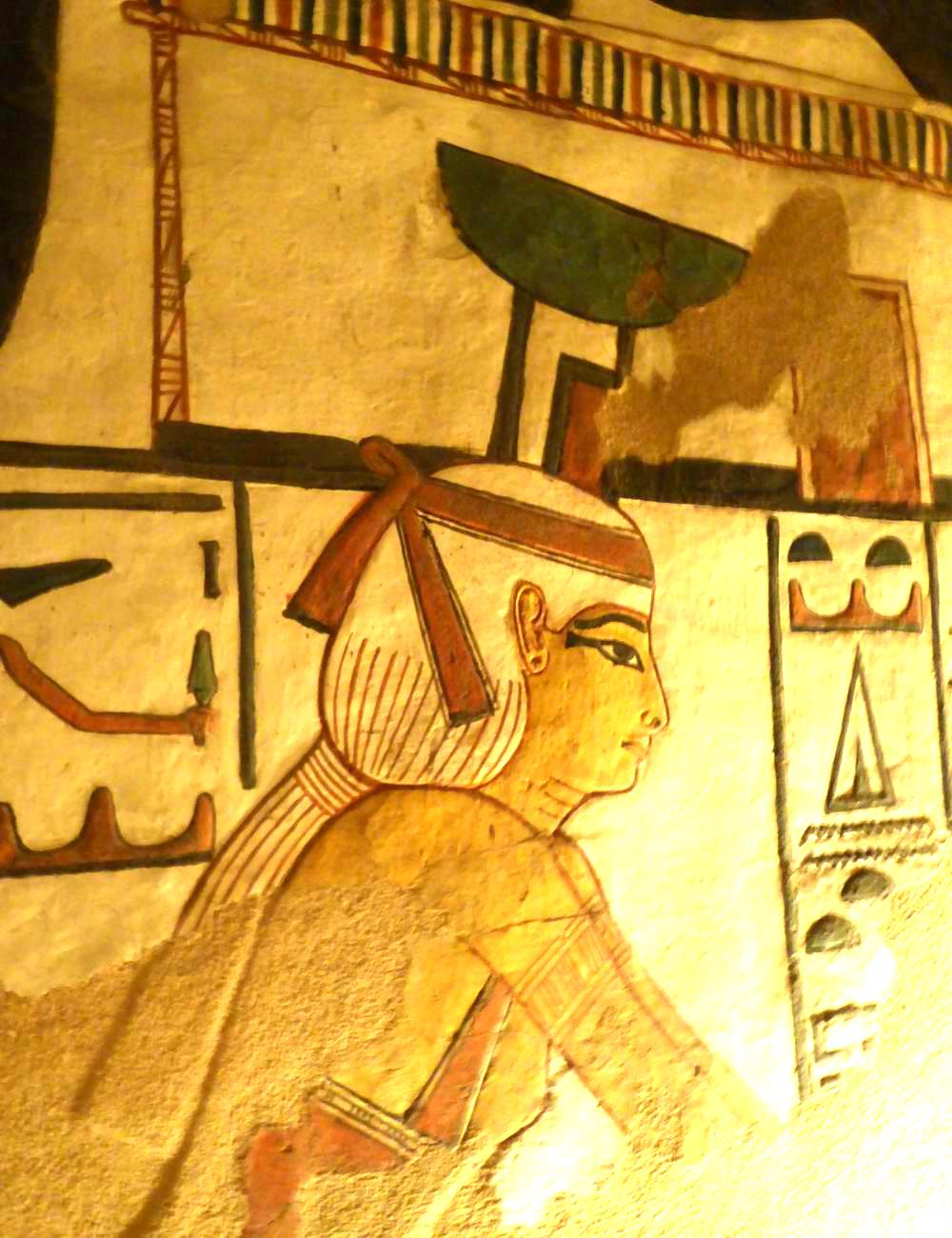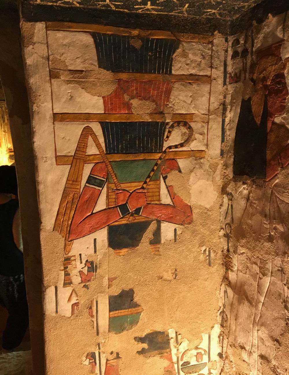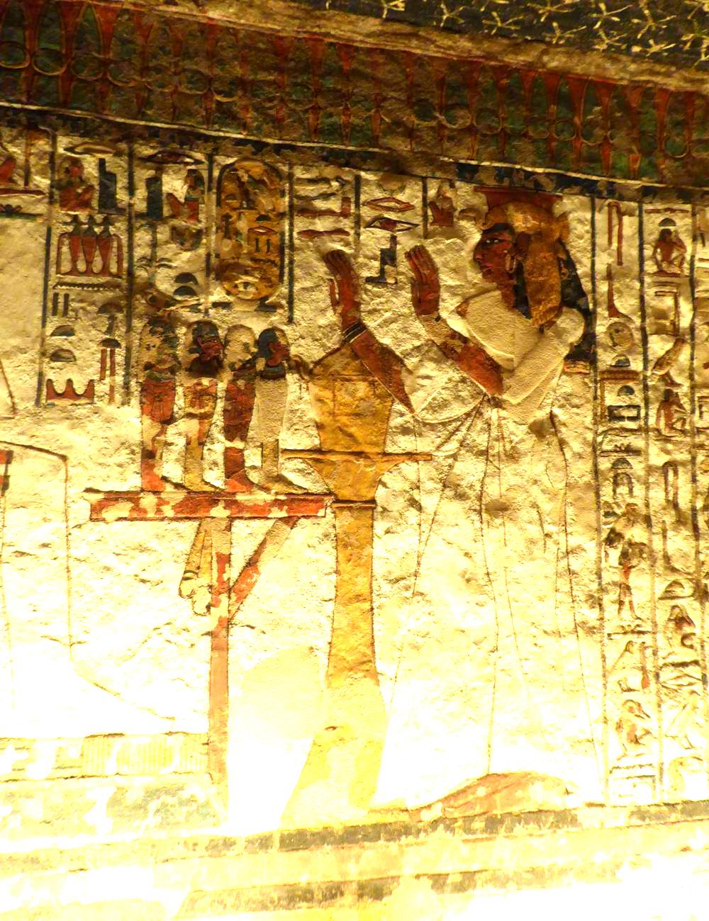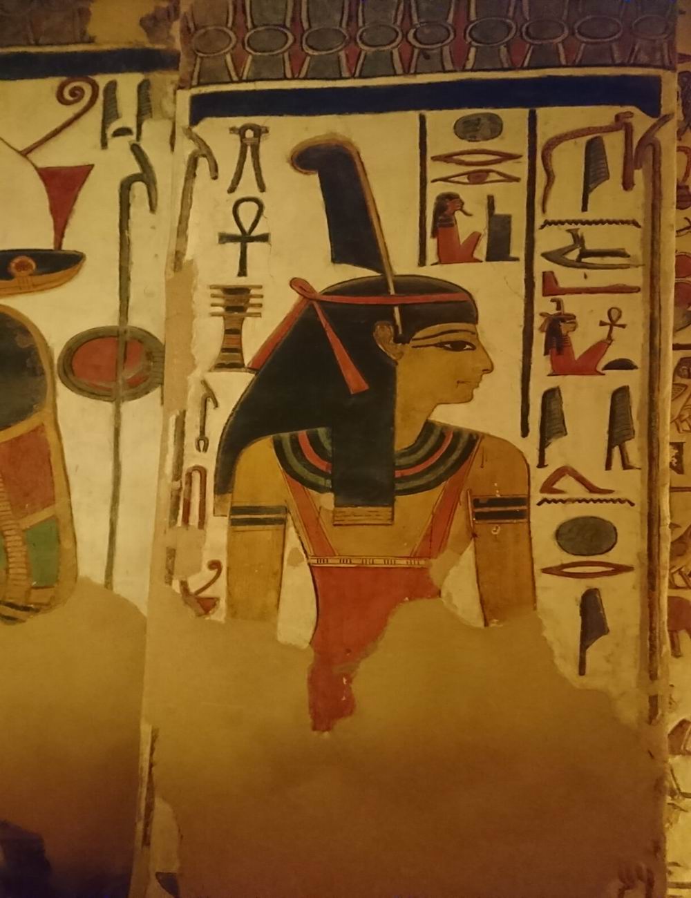 descenderie. A gauche la Reine est debout les bras levés. Sur l'embrasure de la porte la déesse Maât, qui accueille la défunte et le cobra coiffé de la double couronne. Il s'agit de la déesse Ouadjet au Nord.
