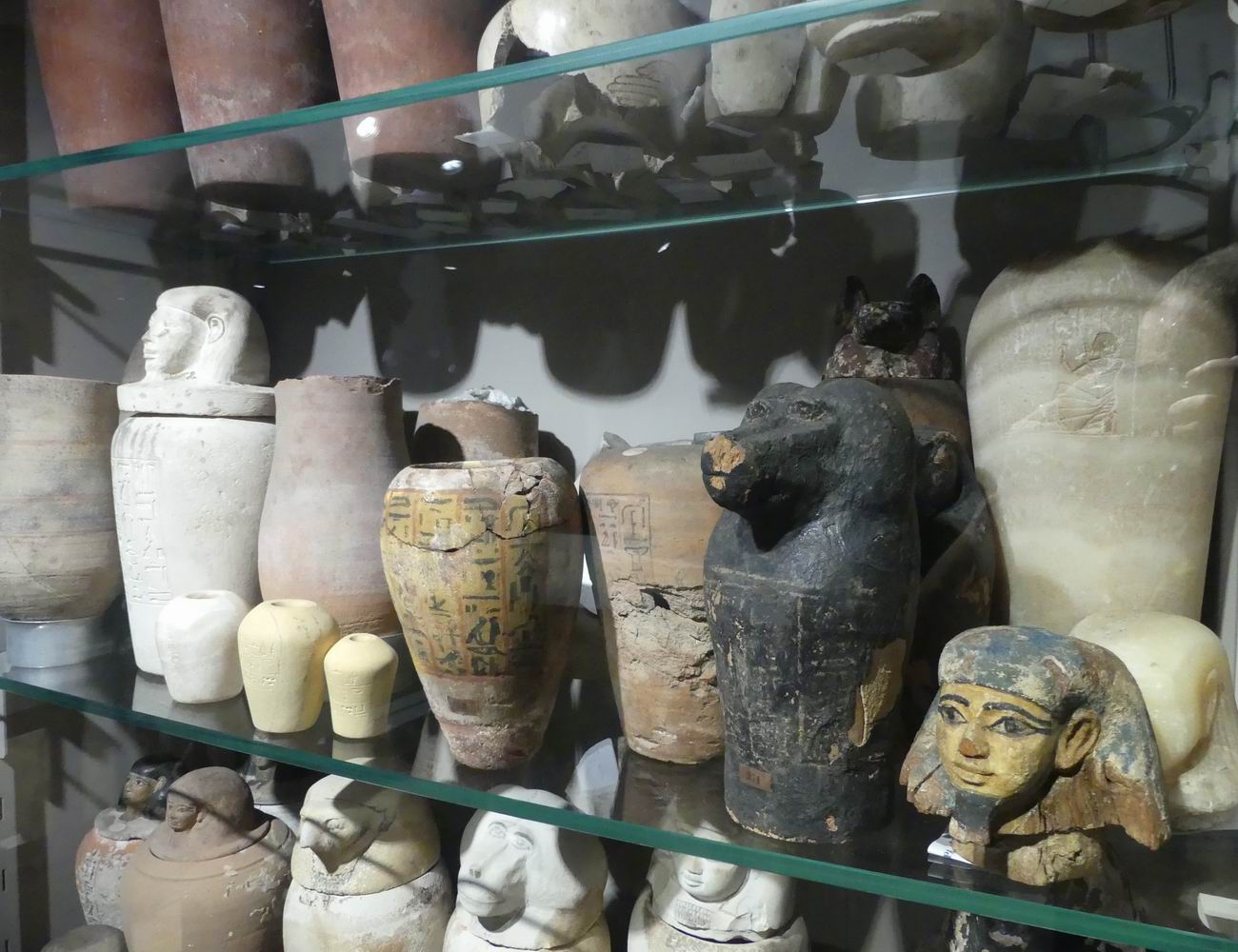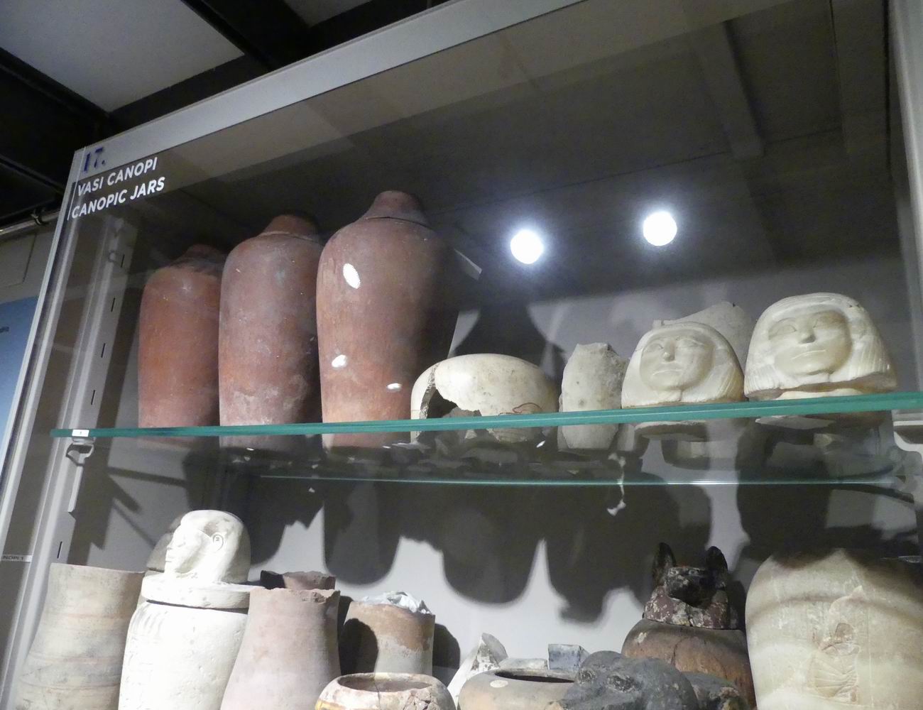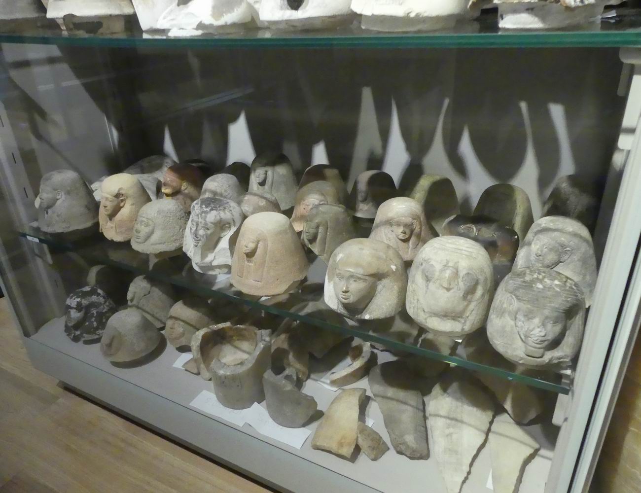 | Vitrine avec des fragments de vases canopes. |