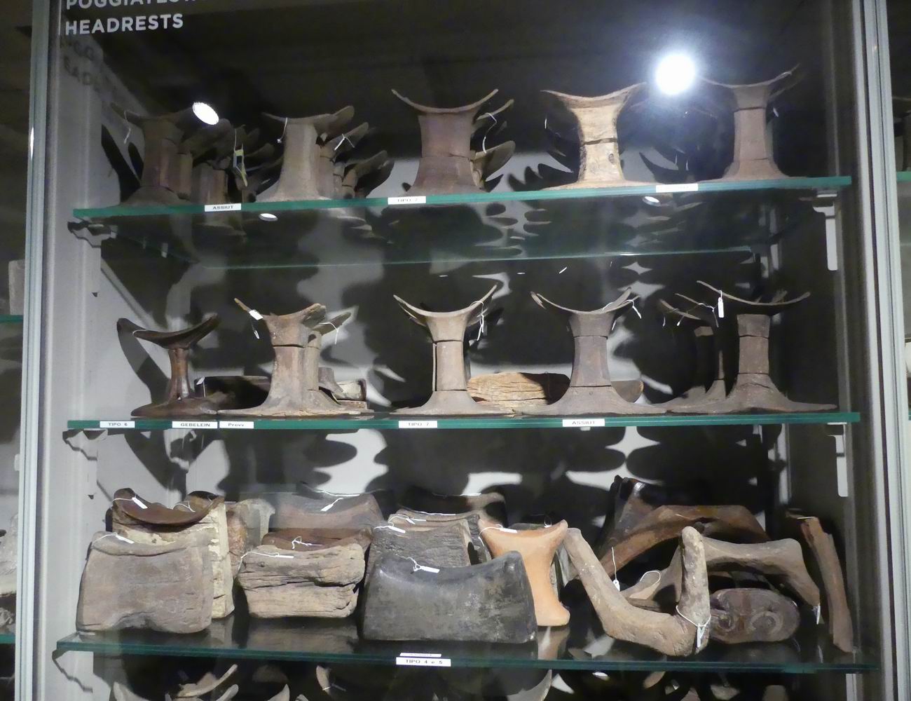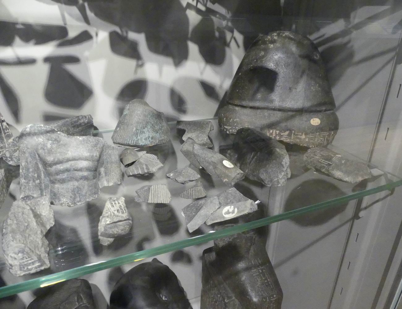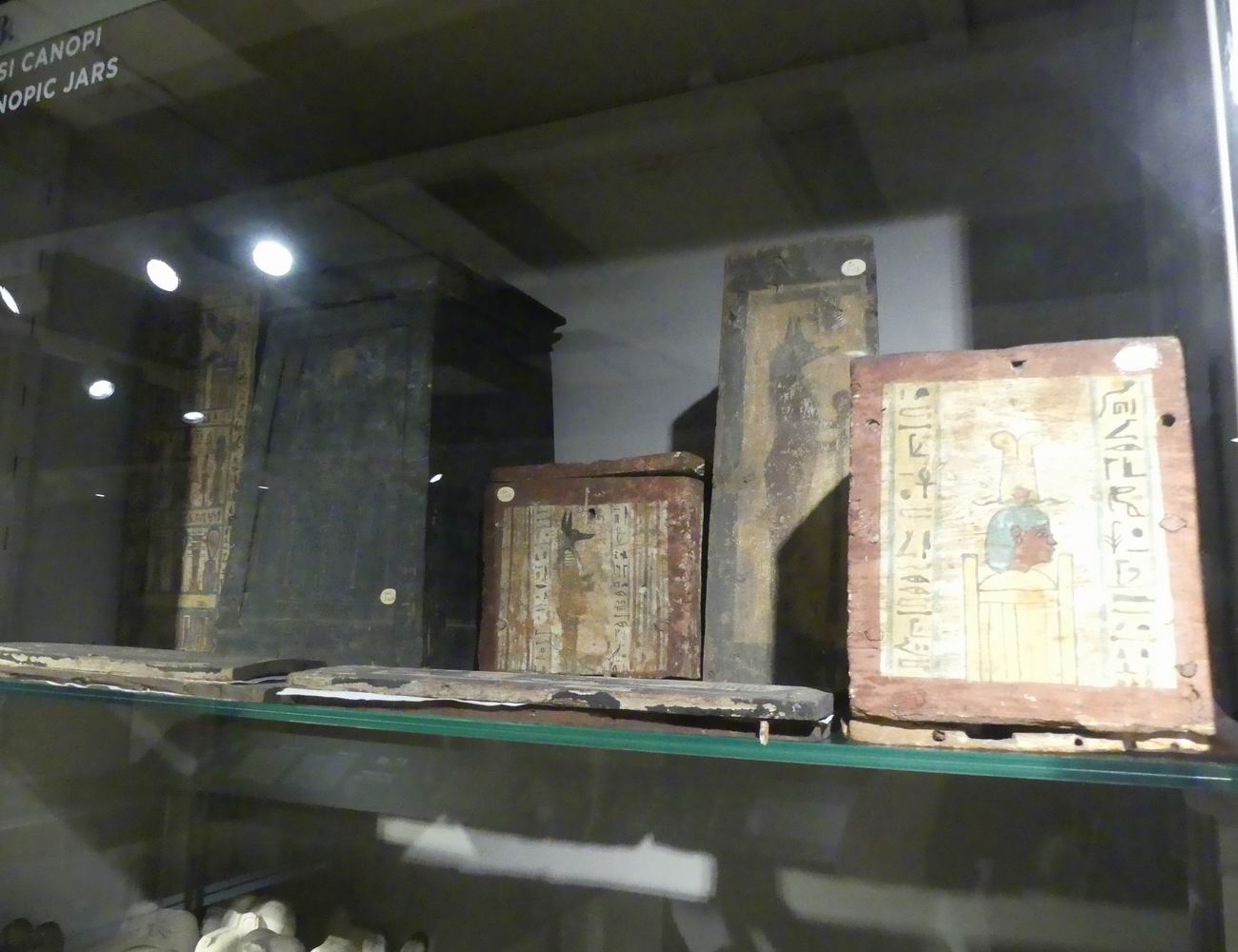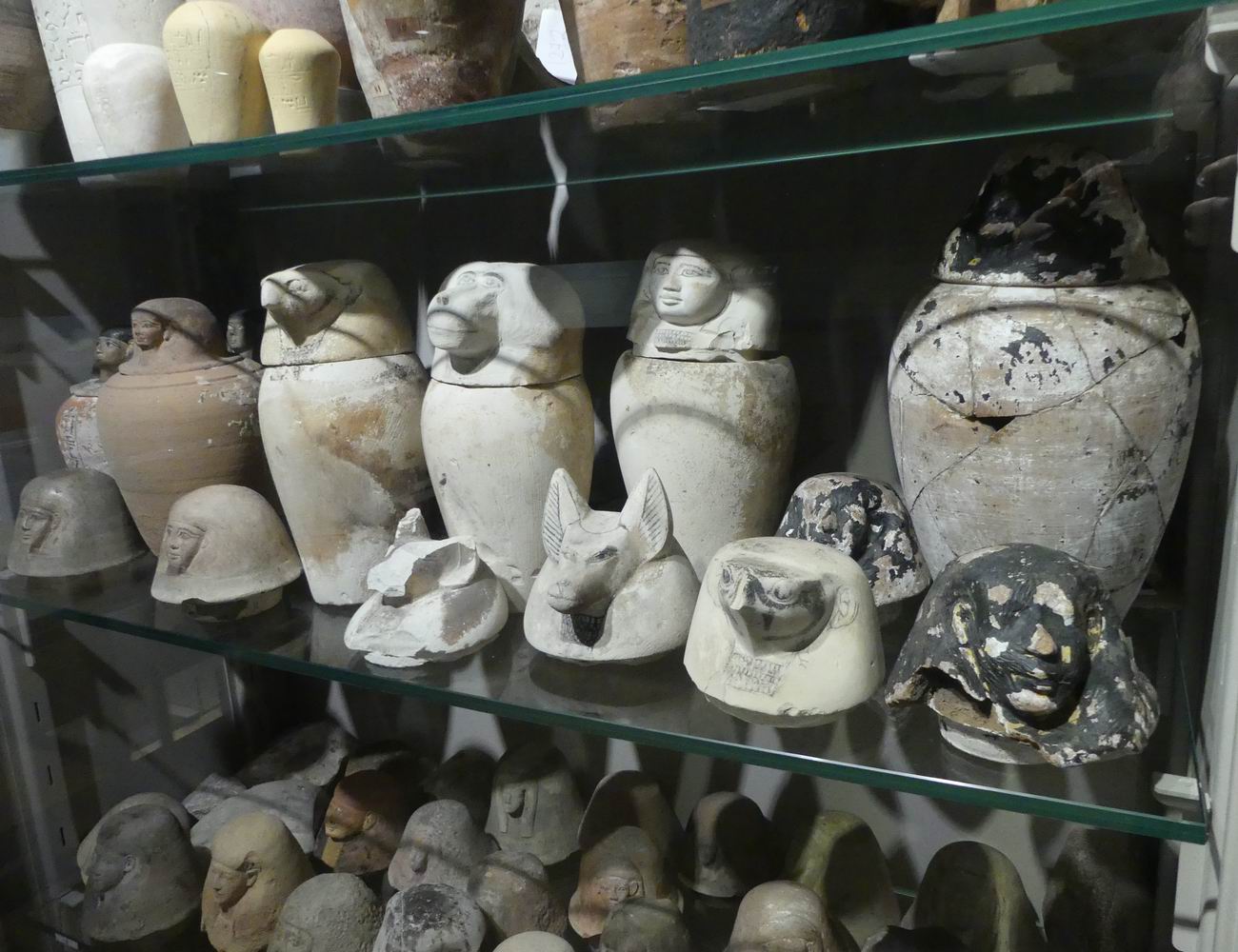 | Vitrine avec des fragments de vases canopes. |